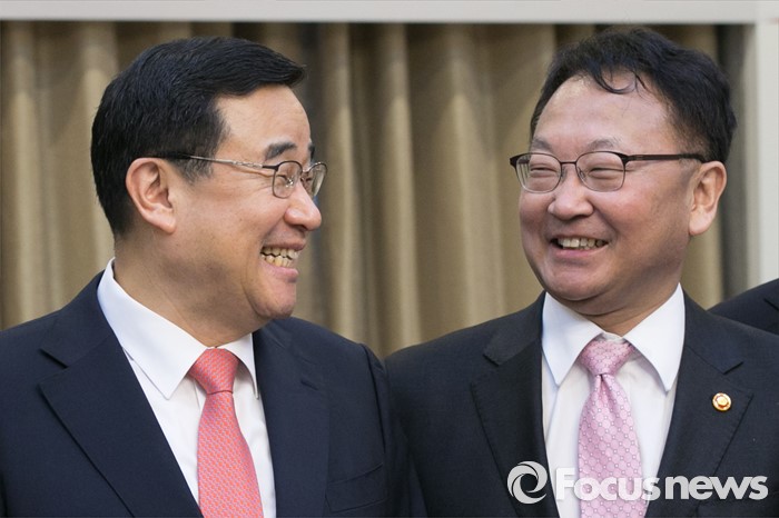 (서울=포커스뉴스) 김정훈(왼쪽) 새누리당 정책위의장과 유일호 경제부총리 겸 기획재정부 장관이 17일 오전 서울 여의도 국회에서 열린 규제프리존특별법 제정을 위한 당정협의에 참석해, 환하게 웃고 있다.