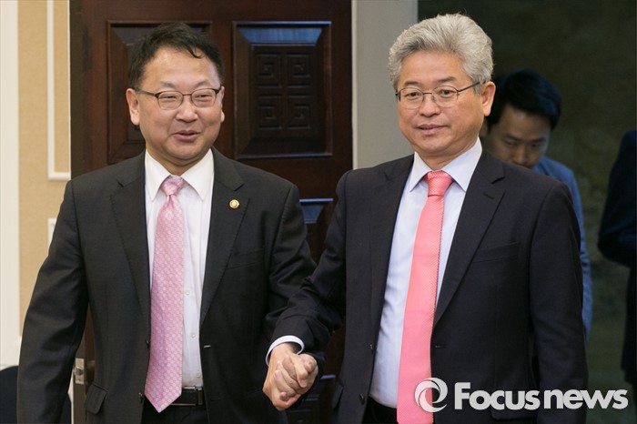 (서울=포커스뉴스) 유일호(왼쪽) 경제부총리 겸 기획재정부 장관과 이철우 새누리당 의원이 17일 오전 서울 여의도 국회에서 열린 규제프리존특별법 제정을 위한 당정협의에 참석하고 있다.