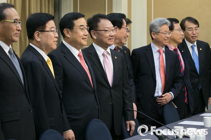 (서울=포커스뉴스) 17일 오전 서울 여의도 국회에서 규제프리존특별법 제정을 위한 당정협의 참석자들이 기념사진을 찍고 있다. 왼쪽부터 홍윤식 행정자치부 장관, 김광림 새누리당 의원, 김정훈 정책위의장, 유일호 경제부총리, 김태원 의원, 최양희 미래부장관, 이철우 의원, 이현재 의원, 이석준 국무조정실장.
