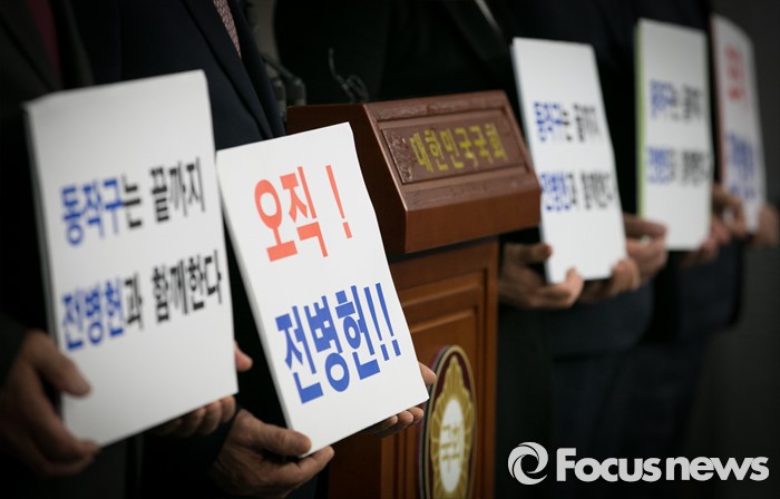 (서울=포커스뉴스) 공천 배제(컷오프)된 전병헌 더불어민주당 의원의 지역위원회 당원들이 17일 오전 서울 여의도 국회 정론관에서 전 의원을 지지하는 기자회견을 하고 있다.