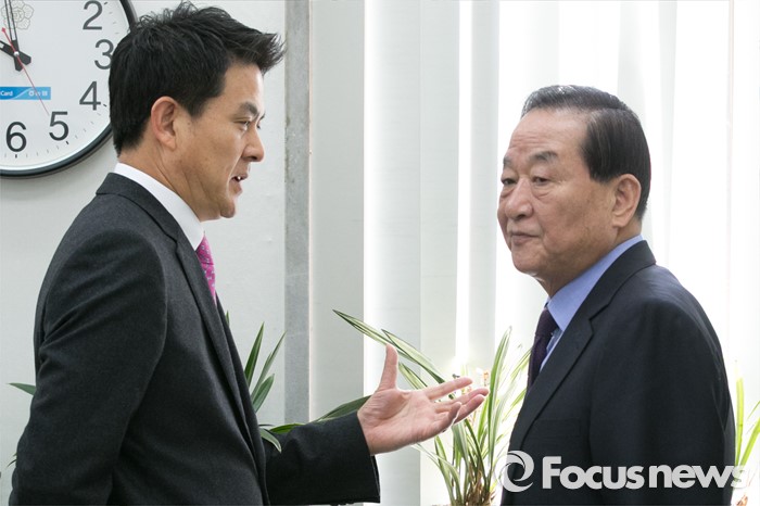 (서울=포커스뉴스) 서청원(오른쪽) · 김태호 새누리당 최고위원이 17일 오전 서울 여의도 국회에서 열린 최고위원회 간담회에 참석해 대화하고 있다. 김무성 대표가 불참한 이날 새누리당 최고위 간담회에서는 원유철 원내대표와 일부 최고위원들이 참석해, 공천관리위원회의 의결과 관련해 논의하는 것으로 알려졌다.