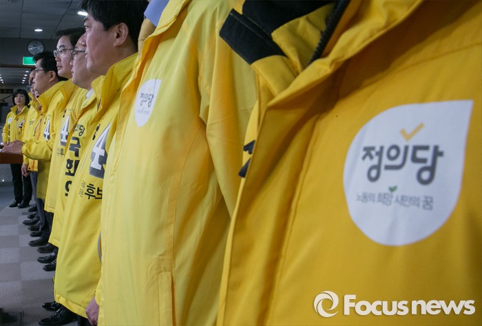 (서울=포커스뉴스) 박원석 정의당 경기도당위원장과 예비후보들이 17일 오전 서울 여의도 국회 정론관에서 야권연대 관련 기자회견을 하고 있다.