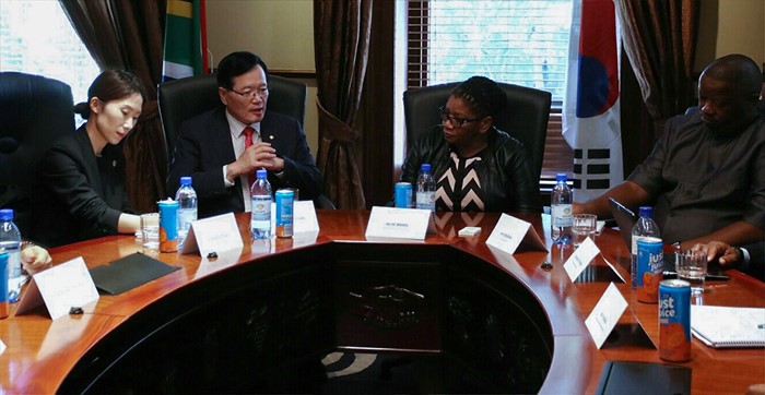 (서울=포커스뉴스) 정의화(왼쪽 두번째) 국회의장이 16일 오후(현지시각) 남아프리카공화국 의회를 방문해 탄디 모디세(Thandi Modise, 오른쪽 두번째) 상원의장과 만나 면담을 하고 있다. 정 의장은 원전과 해양, ICT 산업 등의 분야에서 한국 기업의 남아공 진출과 투자확대를 위한 지원을 요청했다. <사진제공=국회>