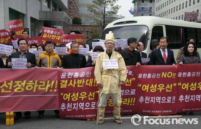 (서울=포커스뉴스) 17일 오후 서울 여의도 새누리당사 앞에서 경남 창원 마산회원구 지역 당원들이 경선을 통해 공천된 윤한홍 예비후보 반대 및 여성우선 공천을 촉구하는 집회를 하고 있다.