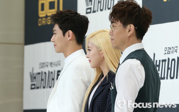 (서울=포커스뉴스) 17일 오후 서울 영등포구 타임스퀘어 아모리스홀에서 열린 OCN 드라마 '뱀파이어 탐정' 제작발표회에 참석한 배우 이준(왼쪽부터), 이세영, 오정세가 포토타임 갖고 있다.