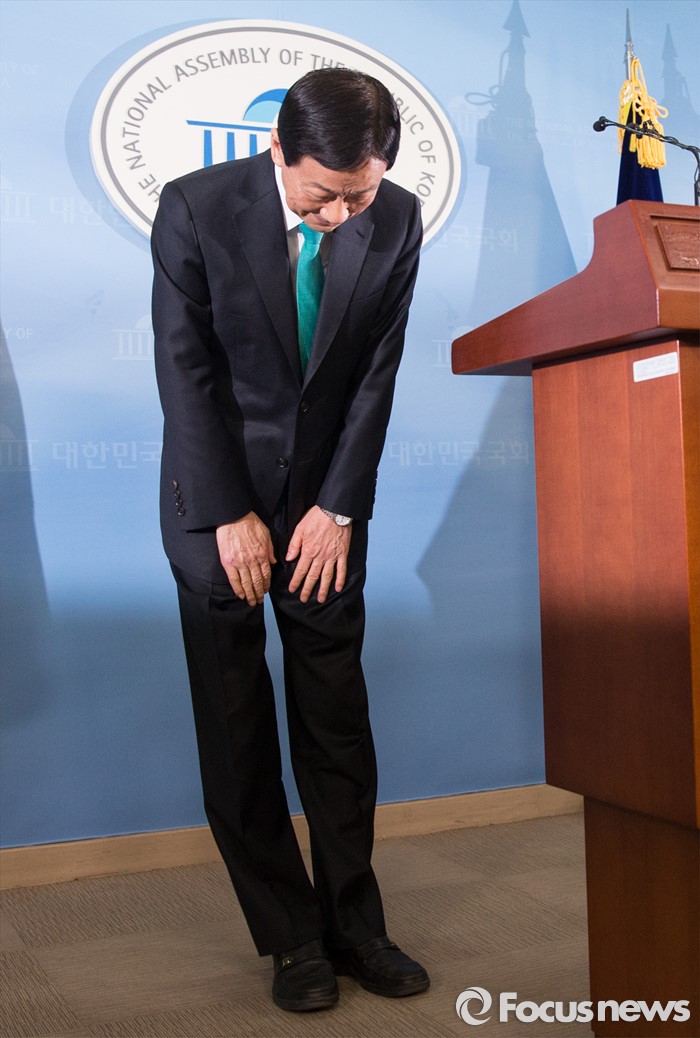 (서울=포커스뉴스) 공천에서 배제 된 새누리당 3선 중진 진영 의원이 17일 오후 서울 여의도 국회 정론관에서 탈당 공식 선언 후 인사하고 있다