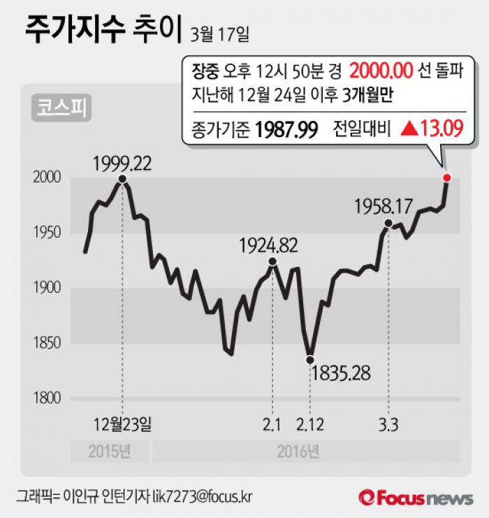 | △ [그래픽] 코스피, 약 3개월만에 장중 2000선 돌파 |