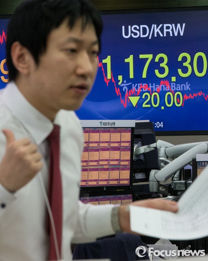 (서울=포커스뉴스) 17일 서울 중구 KEB외환은행 본점 딜링룸 전광판에 원달러환율이 전일 종가 대비 20원 내린 1173.3원를 나타내고 있다. 이날 코스피는 장중 2000선을 돌파했으며, 원·달러 환율은 전일 종가 대비 20원 내린 1173.3원으로 지난해 12월 30일(1172.5원) 이후 약 석달만에 종가 기준 1170원대를 기록했다.
