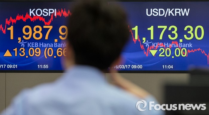 (서울=포커스뉴스) 17일 서울 중구 KEB외환은행 본점 딜링룸 전광판에 코스피지수가 전일보다 13.09p (0.66%) 상승한 1987.99, 원달러환율은 전일 종가 대비 20원 내린 1173.3원를 나타내고 있다. 이날 코스피는 장중 2000선을 돌파했으며, 원·달러 환율은 전일 종가 대비 20원 내린 1173.3원으로 지난해 12월 30일(1172.5원) 이후 약 석달만에 종가 기준 1170원대를 기록했다.