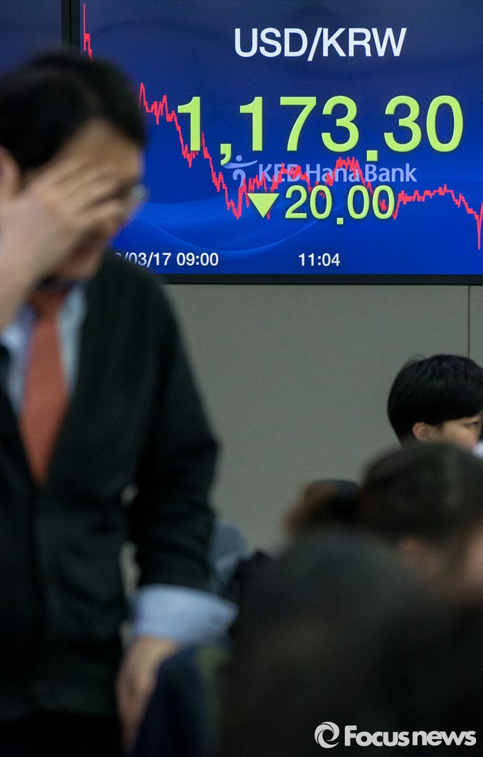 (서울=포커스뉴스) 17일 서울 중구 KEB외환은행 본점 딜링룸 전광판에 원달러환율이 전일 종가 대비 20원 내린 1173.3원를 나타내고 있다. 이날 코스피는 장중 2000선을 돌파했으며, 원·달러 환율은 전일 종가 대비 20원 내린 1173.3원으로 지난해 12월 30일(1172.5원) 이후 약 석달만에 종가 기준 1170원대를 기록했다.