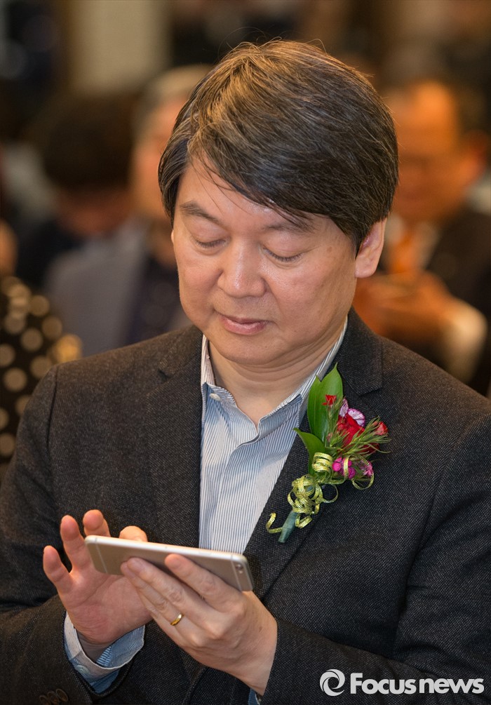 (청주=포커스뉴스) 17일 오후 충북 청주 흥덕구 리호관광호텔에서 열린 국민의당 충북도당 창당대회에서 안철수 공동대표가 핸드폰을 만지고 있다.