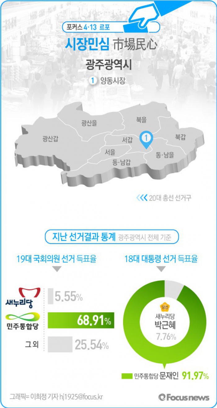 (서울=포커스뉴스) 16일 찾은 광주의 양동시장에서는 호남 여론의 '창'인 양동시장에선 더민주에 대한 광주시민들의 실망감과 국민의당에 대한 지지를 확인할 수 있었고 안철수 돌풍의 실체도 엿볼 수 있었다. 광주지역 역대 선거를 보면 야권의 100% 승리였다.