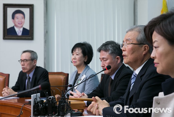(서울=포커스뉴스) 김종인(오른쪽 두번째) 더불어민주당 비대위 대표가 18일 오전 서울 여의도 국회에서 비대위-선대위 연석회의를 마친 뒤 기자간담회를 열고 공천 배제(컷오프)된 정청래 의원의 지역구인 마포을에 손혜원(왼쪽 두번째) 홍보위원장 전략 공천을 발표하고 있다.