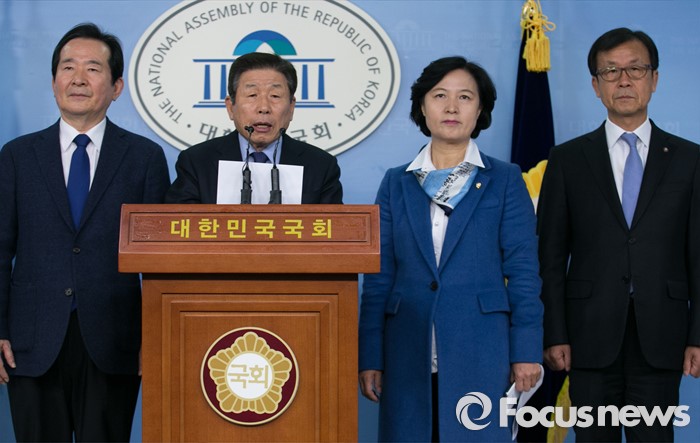 (서울=포커스뉴스) 더불어민주당 중진 의원들이 18일 오전 서울 여의도 국회 정론관에서 수도권 중심 야권 연대를 촉구하는 기자회견을 하고 있다. 왼쪽부터 정세균, 유인태, 추미애, 원혜영 의원.