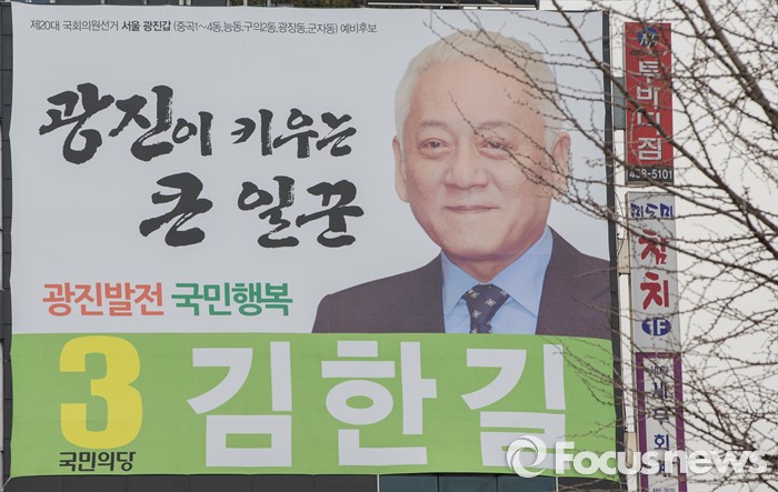 (서울=포커스뉴스) 김한길 국민의당 의원이 야권연대 무산 책임을 지고 20대 총선 불출마를 선언한 가운데 17일 오후 서울 광진구의 김 의원 선거사무소 건물에 20대 총선 예비후보 현수막이 걸려 있다.