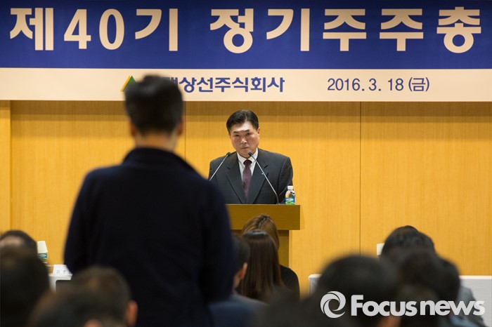 (서울=포커스뉴스) 이백훈 현대상선 대표이사가 18일 오전 서울 종로구 현대그룹빌딩에서 열린 제40기 정기주주총회에서 한 주주의 의사발언을 듣고 있다.