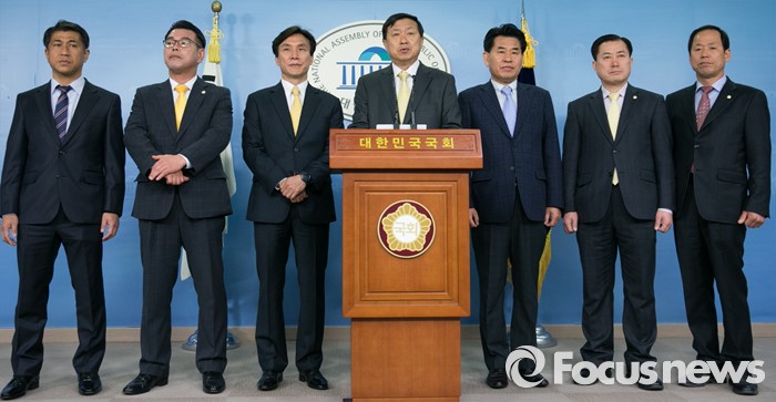 (서울=포커스뉴스) 더불어민주당을 탈당한 신기남(왼쪽 네번째) 의원이 18일 오전 서울 여의도 국회 정론관에서 원외 정당인 민주당 입당 기자회견을 하고 있다. 왼쪽 세번째는 김민석 민주당 대표.