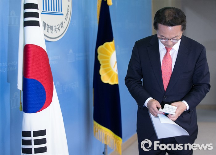 (서울=포커스뉴스) 공천 탈락한 조해진 새누리당 의원이 18일 오전 서울 여의도 국회 정론관에서 탈당 및 20대 총선 무소속 출마 기자회견을 마친 뒤 퇴장하고 있다.