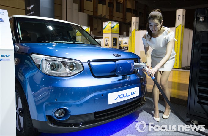 (제주=포커스뉴스) 18일 오전 제주 서귀포 제주국제컨벤션센터에서 열리고 있는 2016 국제전기자동차엑스포에서 기아 전기자동차의 한 관계자가 '소울'의 충전 방식을 설명하고 있다.
