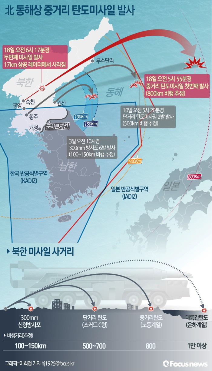 (서울=포커스뉴스) 북한이 18일 동해상을 탄도미사일 2발을 발사했다. 오전 6시 55분경 발사된 첫 번째 미사일은 800km 정도를 비행해 일본방공식별구역(JADIZ) 내에 낙하한 것으로 알려졌다. 오전 6시 17분경 추가 발사된 두 번째 미사일은 17Km 상공레이더에서 사라져 공중폭발했을 가능성이 제기된다.