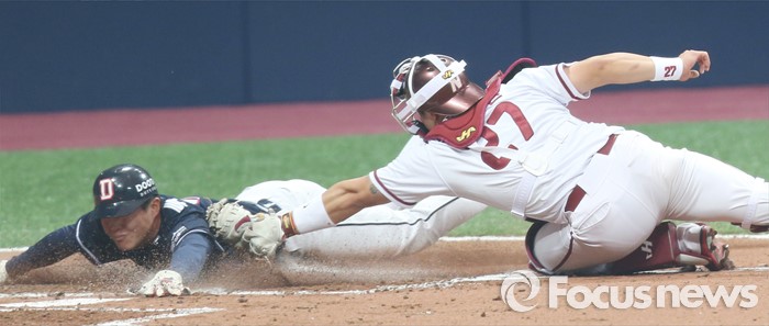 (서울=포커스뉴스) 18일 서울 고척스카이돔에서 열린 2016 프로야구 시범경기 두산-넥센 경기 3회초 2사 1,2루에서 두산 허경민의 중전안타때 2루주자 류지혁이 홈까지 파고들었으나 넥센 중견수 유재신의 정확한 송구로 아웃되고 있다.