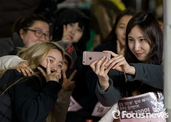 (서울=포커스뉴스) 18일 오전 서울 종로구 일본대사관 앞에서 열린 '한일 위안부 합의 폐기, 소녀상 철거 반대 대학생 100인 농성'에 참석한 학생들이 기념촬영을 하고 있다.
