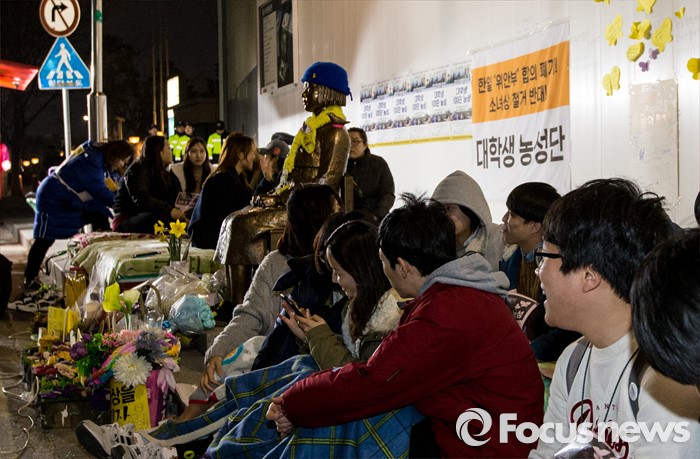 (서울=포커스뉴스) 18일 오전 서울 종로구 일본대사관 앞에서 열린 '한일 위안부 합의 폐기, 소녀상 철거 반대 대학생 100인 농성'에 참석한 학생들이 소녀상 곁을 지키고 있다.