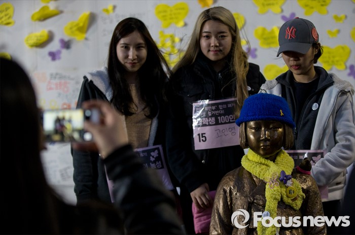 (서울=포커스뉴스) 18일 오전 서울 종로구 일본대사관 앞에서 열린 '한일 위안부 합의 폐기, 소녀상 철거 반대 대학생 100인 농성'에 참석한 학생들이 기념촬영을 하고 있다.