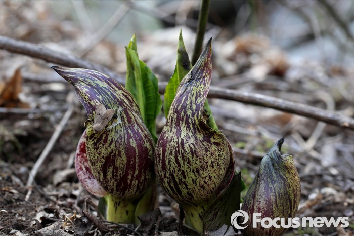 (하남=포커스뉴스)봄 기운이 완연한 19일 오전 경기도 하남시 검단산자락에 앉은부채들이 겨우내 얼었던 대지를 뚫고 돋아나, 새봄을 알리고 있다. 보랏빛을 띠는 꽃이 먼저 피고, 잎은 꽃이 시든 후에 펼쳐진다. <사진제공=이준택교수>
