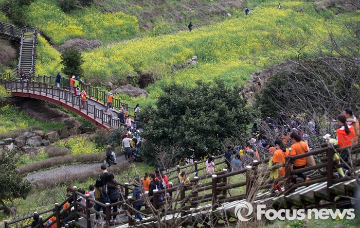(제주=포커스뉴스)19일 오전 제주 서귀포 중문관광단지 일원에서 제18회 서귀포 유채꽃 국제걷기대회가 열리고 있다. 걷기대회에 참가한 관광객들이 엉덩물계곡 유채꽃길을 걷고 있다.