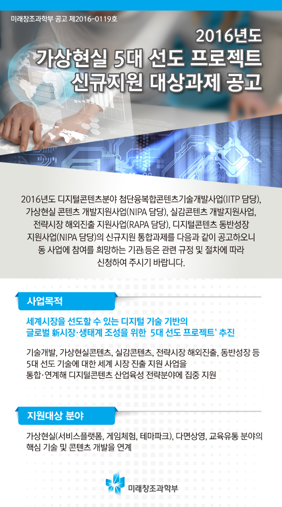 지난 2월19일, 미래부와 문화관광체육부는 공동 간담회에서 가상현실 분야에 향후 3년간 약 1850억원 투자한다는 가상현실 플래그십 프로젝트를 내놨다. 연구개발(R&D), 콘텐츠 개발, 실증사업 지원 등을 통합·연계 지원하는 방식으로 향후 2년간 약 500억원을 투자한다는 계획이다. 성과가 우수할 경우 추가 2년을 더 지원해 민관이 공동으로 본격적인 가상현실 생태계 조성 및 신시장 선점을 추진한다는 방침이다.