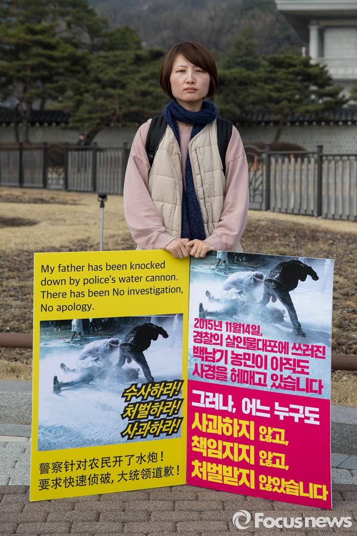 (서울=포커스뉴스) 20일 오후 서울 종로구 청운동사무소 분수대에서 백도라지씨가 경찰의 수사와 사과를 촉구하며 1인 시위를 하고 있다. 이날 백씨는 지난해 11월 집회 도중 물대포에 맞아 쓰러진 아버지 백남기씨 사건에 대한 경찰당국의 정확한 수사와 사과를 촉구했다.