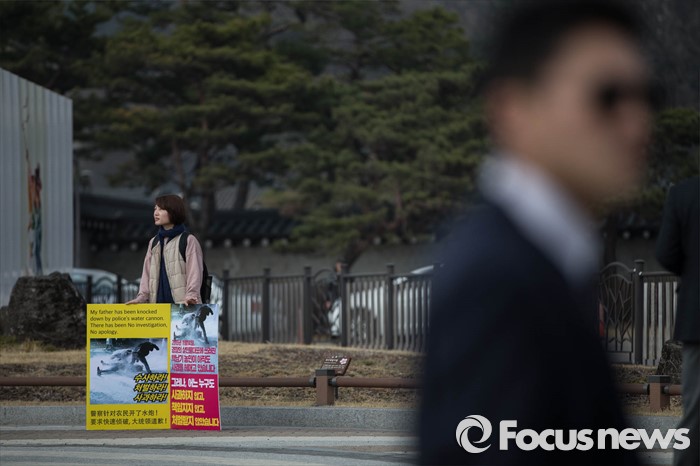 (서울=포커스뉴스) 20일 오후 서울 종로구 청운동사무소 인근 분수대에서 백도라지씨가 경찰의 수사와 사과를 촉구하며 1인시위를 하고 있다. 이날 백씨는 지난해 11월 집회 도중 물대포에 맞아 쓰러진 아버지 백남기씨 사건에 대한 경찰당국의 정확한 수사와 사과를 촉구했다.