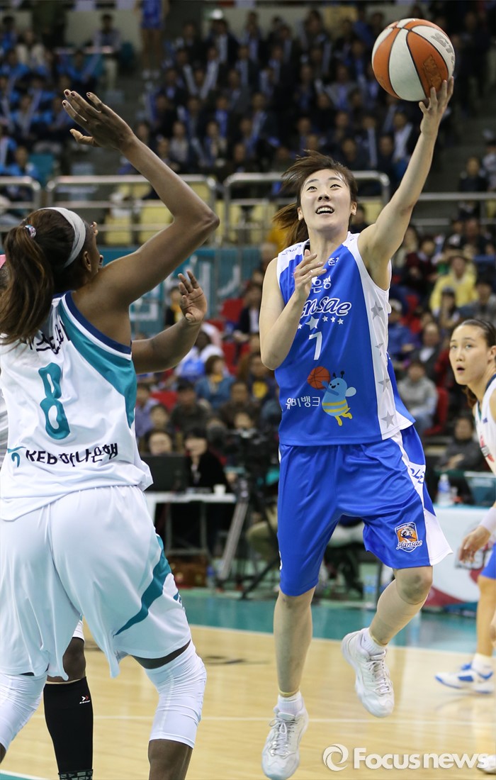 (부천=포커스뉴스) 20일 부천체육관에서 열린 2015-2016 여자프로농구 챔피언결전전 3차전 KEB하나은행-우리은행 경기에서 우리은행 박혜진이 KEB하나 모스비의 수비를 피하며 레이업슛을 쏘고 있다.