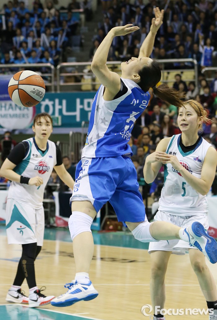 (부천=포커스뉴스) 20일 부천체육관에서 열린 2015-2016 여자프로농구 챔피언결전전 3차전 KEB하나은행-우리은행 경기에서 우리은행 이은혜가 돌파를 시도하다 KEB하나 김이슬의 수비에 걸리며 볼을 놓치고 있다.