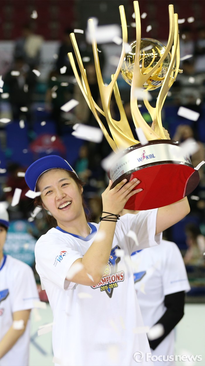 (부천=포커스뉴스) 20일 부천체육관에서 열린 2015-2016 여자프로농구 챔피언결정전 3차전에서 승리하며 KEB하나에게 3승으로 통합챔피언을 차지한 우리은행 주장 양지희가 우승트로피를 들어 보이고 있다.