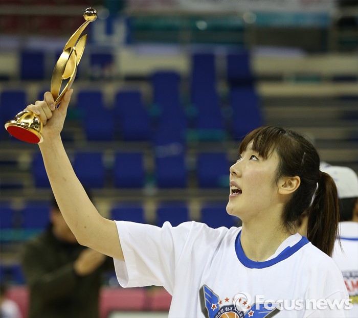 (부천=포커스뉴스) 20일 부천체육관에서 열린 2015-2016 여자프로농구 챔피언결정전에서 MVP로 선정된 우리은행 박혜진이 트로피를 들어 보이고 있다.