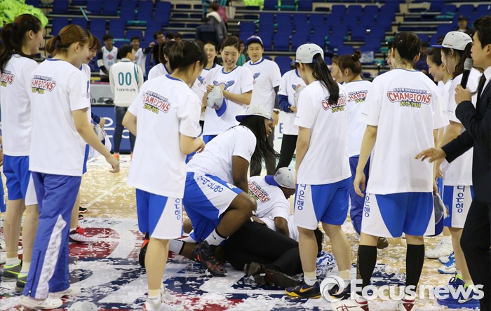 (부천=포커스뉴스) 20일 부천체육관에서 열린 2015-2016 여자프로농구 챔피언결정전 3차전에서 KEB하나은행을 물리치고 3승으로 통합 우승을 차지한 우리은행 선수들이 위성우 감독을 헹가래친 후 뒤풀이를 하고 있다.