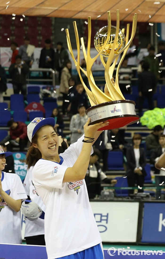 (부천=포커스뉴스) 20일 부천체육관에서 열린 2015-2016 여자프로농구 챔피언결정전 3차전에서 KEB하나은행을 물리치고 3승으로 통합 우승을 차지한 우리은행 주장 양지희가 우승 트로피를 들어 올리며 기뻐하고 있다.