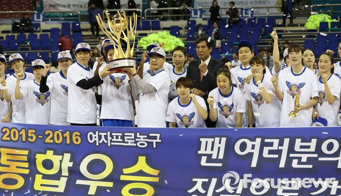 (부천=포커스뉴스) 20일 부천체육관에서 열린 2015-2016 여자프로농구 챔피언결정전 3차전에서 승리하며 KEB하나에게 3승으로 통합챔피언을 차지한 우리은행 양지희와 굿렛이 우승 트로피를 보고 있다. 뒤는 전주원 코치.