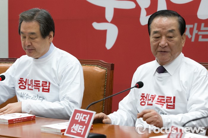 (서울=포커스뉴스) 김무성(왼쪽) 새누리당 대표와 서청원 최고위원이 21일 오전 서울 여의도 국회에서 열린 최고위원회의에 참석해 자리에 앉아 있다.