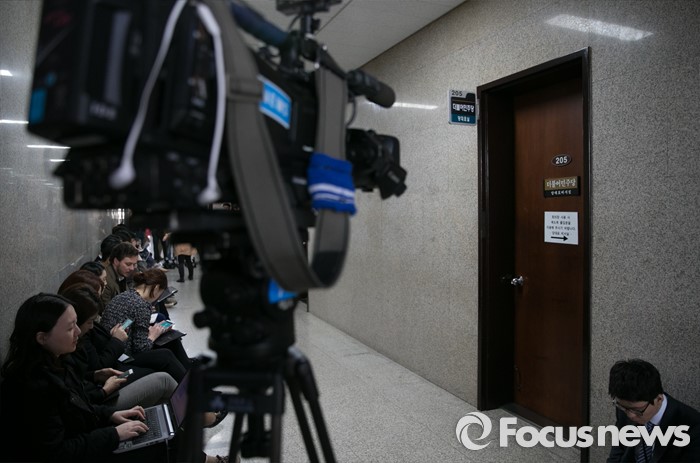 | △ 더불어민주당 회의실 앞 지키는 취재진 |