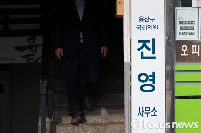 (서울=포커스뉴스) 21일 오전 서울 용산구 진영 의원 지역구 사무실 간판의 정당과 기호 표시가 가려져 있다. 진 의원은 새누리당에서 공첸 배제된 뒤 탈당해 더불어민주당으로 입당했다.