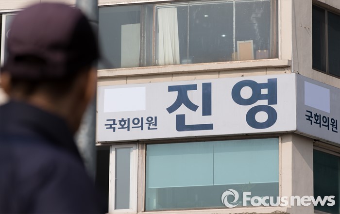 (서울=포커스뉴스) 21일 오전 서울 용산구 진영 의원 지역구 사무실 간판의 정당과 기호 표시가 가려져 있다. 진 의원은 새누리당에서 공첸 배제된 뒤 탈당해 더불어민주당으로 입당했다.