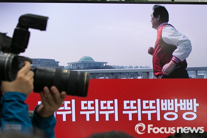 (서울=포커스뉴스) 21일 오전 서울 여의도 국회에서 열린 새누리당 최고위원회의에서 20대 총선 홍보 노래영상이 상영되고 있다.