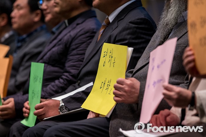 (서울=포커스뉴스) 21일 오전 서울 중구 프레스센터 국제회의장에서 열린 '제1차 한반도평화회의'에 참석한 종교계와 시민단체 관계자들이 남북간 무력시위 중단 및 개성공단 재가동을 촉구 하고 있다.