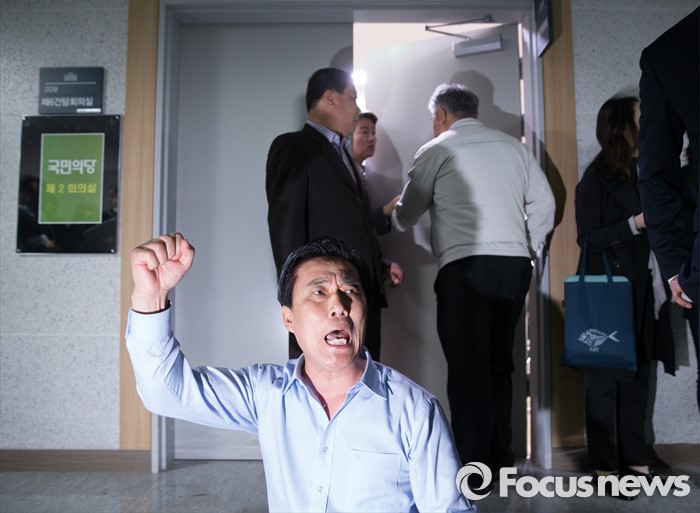 (서울=포커스뉴스) 21일 오전 서울 여의도 국회 의원회관에서 열린 국민의당 최고위원회의장 앞에서 김재원 후보측 김승식 선대위원장이 박준영 전 전남지사 전략공천에 항의하고 있다.