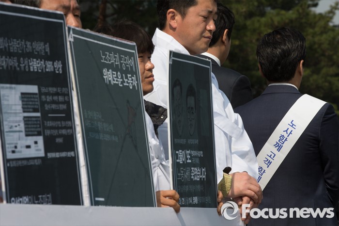 (서울=포커스뉴스) 21일 오전 서울 서초구 현대자동차 본사에서 열린 유성기업 故 한광호 사망 현대자동차 규탄 기자회견에서 유성기업 공대위와 시민사회단체들이 피켓을 들고 있다.