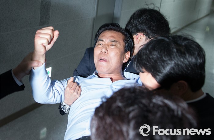 (서울=포커스뉴스) 21일 오전 서울 여의도 국회 의원회관에서 열린 국민의당 최고위원회의장 앞에서 김재원 후보측 김승식 선대위원장이 박준영 전 전남지사 전략공천에 항의하다 경위들에 의해 끌려나가고 있다.