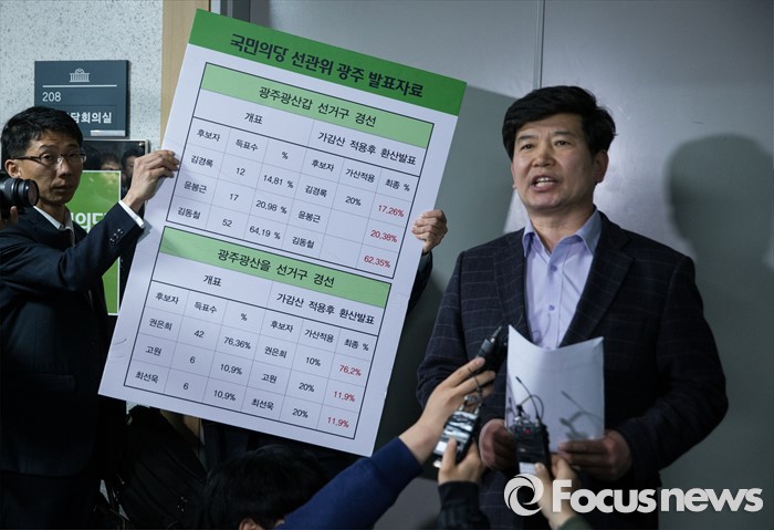 (서울=포커스뉴스) 21일 오전 서울 여의도 국회 의원회관에서 열린 국민의당 최고위원회의 회의장 앞에서 당원들이 호남 지역구 공천 결과에 대해 항의하고 있다.